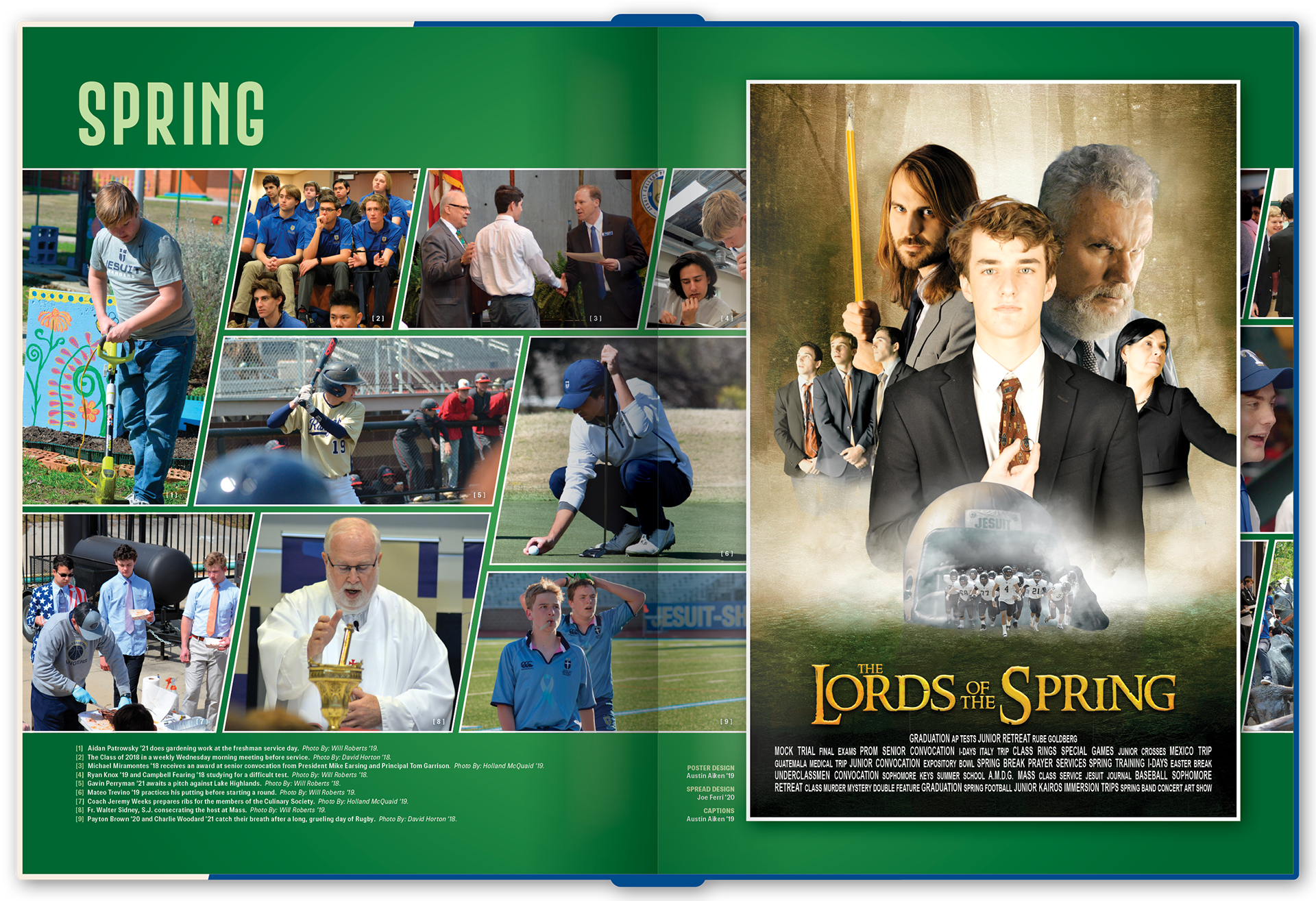 Our 2018 book was inspired by the fact that while yearbooks generally cover the "finished product" of events & organizations, things like practices and preparations are rarely included – hence "Behind the Scenes". Once we had a conceptual concept in place, that led to developing movie-inspired visual concepts while consciously avoiding the utilization of any obvious or cliché imagery.
