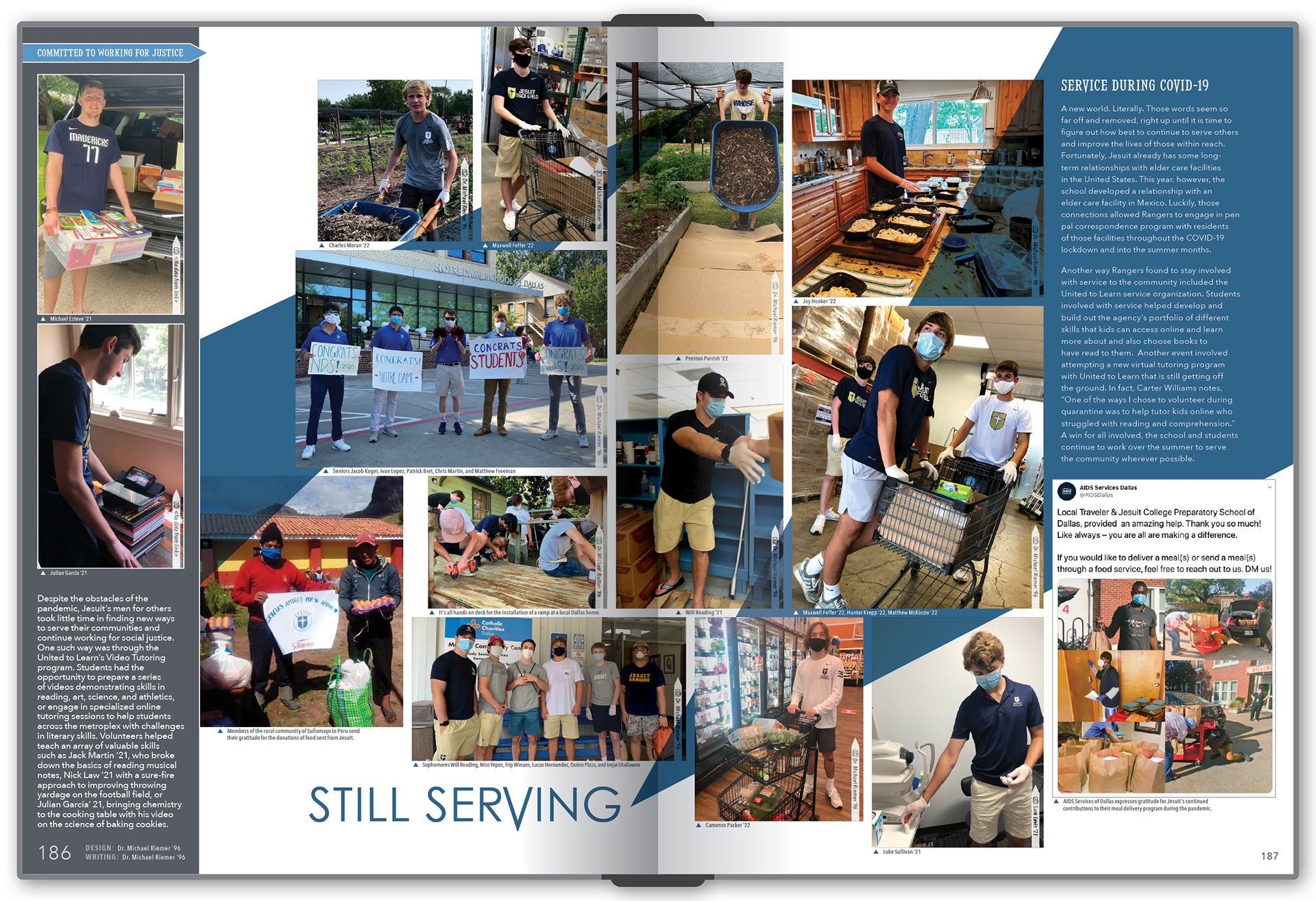 We also incorporated a thin sidebar along the right side of every spread because of that desire for consistency. That consistent sidebar ended up providing for an interesting & unexpected opportunity mid-year when everything got turned upside-down — and so, for our pages covering the impact of Covid in the spring of 2020, we reversed the template and placed the sidebar for those spreads on the left side.