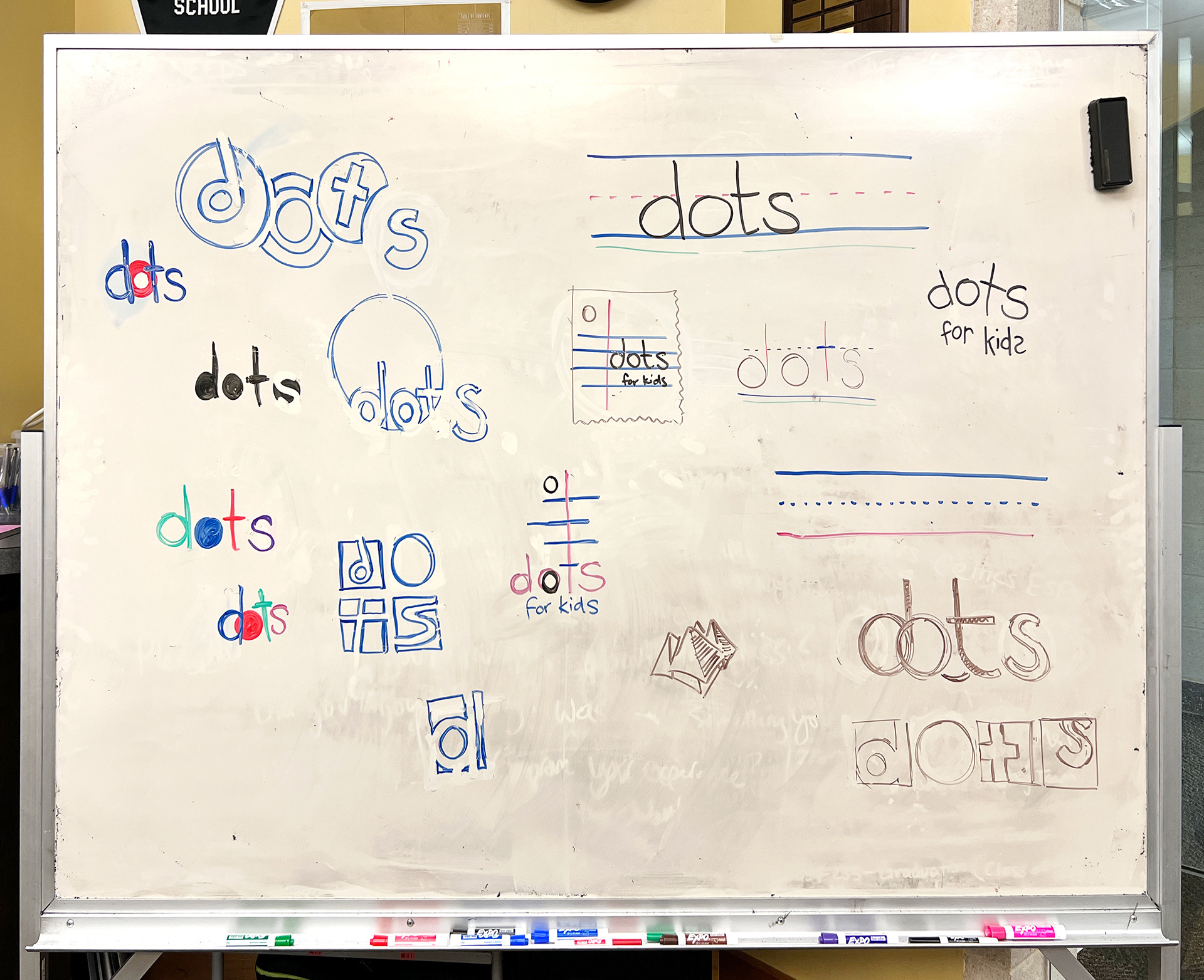 My colleague and I explored several possibilities for D.O.T.S.’ new visual brand, and presented multiple rounds of options to the client (bottom-right). In the end, once the client selected a look that they loved, we were also able to present them with some recommendations for the utilization of the logo as well as an expansion beyond the logo for visuals that would complement the brand in areas including apparel and the interior design of their offices.